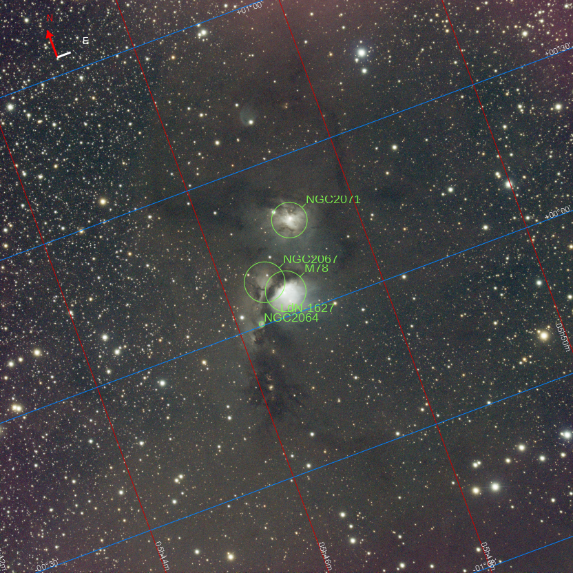 M78 (ou NGC 2064) est une nébuleuse par réflexion située dans la constellation d’Orion et découverte en 1780 par Pierre Méchain. C’est la nébuleuse diffuse la plus brillante d’un groupe de nébuleuses qui comprend NGC 2067 et NGC 2071. M78 est un nuage de poussière interstellaire qui brille par réflexion de la lumière des brillantes étoiles bleues (de type spectral B). Son extension est de l’ordre de 4 années lumière, à une distance de 1600 années lumière.